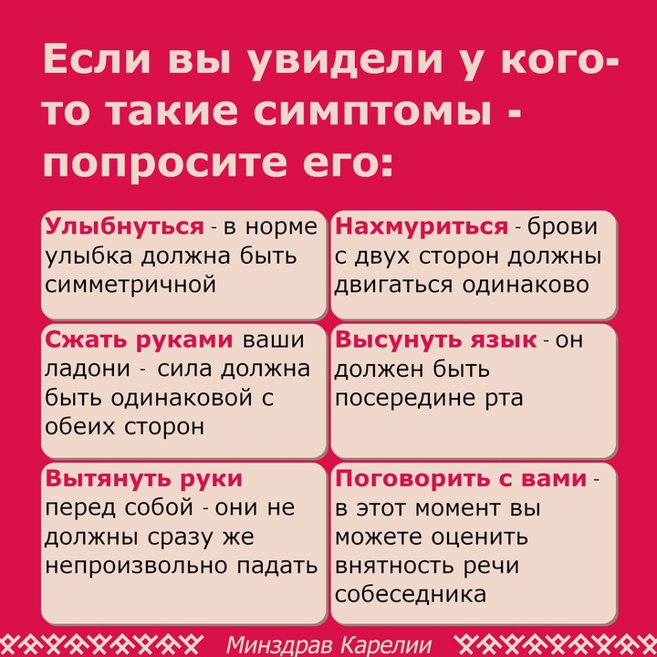 Инсульт не всегда выглядит так, как показывают в кино. Но определенная симптоматика у него есть. Если кружится голова и теряется координация, если онемела или внезапно ослабла половина тела, если резко и сильно заболела голова, тошнит и рвет, стало трудно говорить и понимать окружающих, нужно немедленно вызвать Скорую. По словам министра, помощь нужна в течение четырех-шести часов.