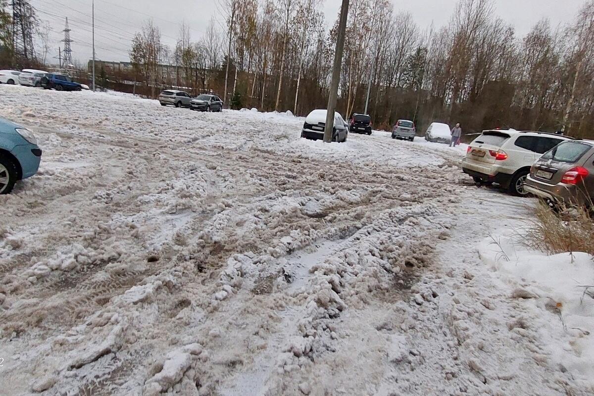 Местные жители жалуются, что из-за оттепели, которая началась 2 ноября на стоянке образовалась каша из снега и воды. Ночью всю слякоть подморозило, и парковка покрылась льдом и грязью.