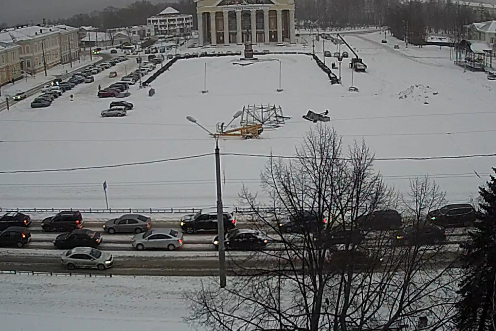 В 10:30 на площади уже появился каркас для новогодней красавицы, а также подъёмные краны. Следить за установкой символа нового года можно в реальном времени на сайте «Ситилинк».