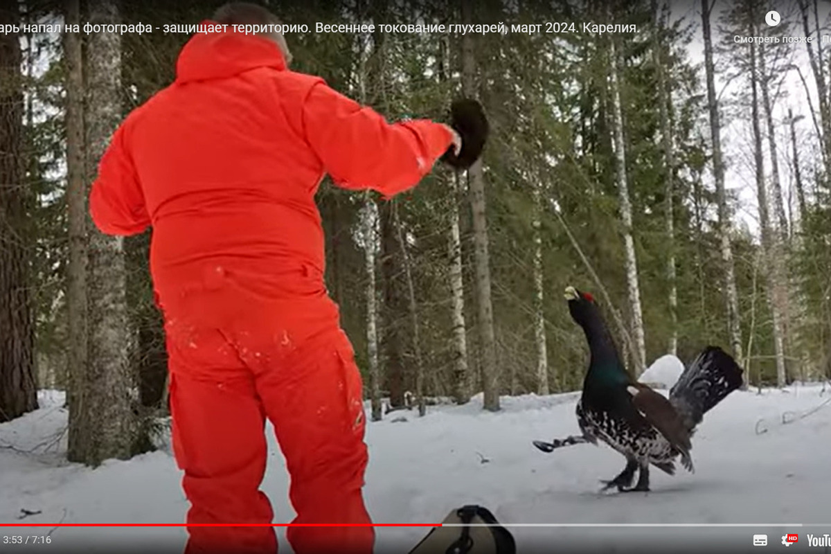 Илья Тимин, известный своими снимками природы фотограф, показал, как отбивал у глухаря снаряжение. Ситуация  возникла в Прионежье в зеленой зоне. Фотограф отправился на территорию, где токуют глухари, чтобы поставить фотоловушки и порадовать аудиторию «живыми» снимками.