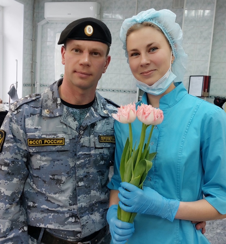 Во-вторых, без любви ничего не происходит, поэтому и здесь она тоже была. Как оказалось, младший судебный пристав Роман Переплеткин когда-то встретил на Станции переливания крови Викторию, операционную медицинскую сестру - влюбился и женился. И здесь во время акции получил шанс сюрпризом поздравить любимую с 8 марта.