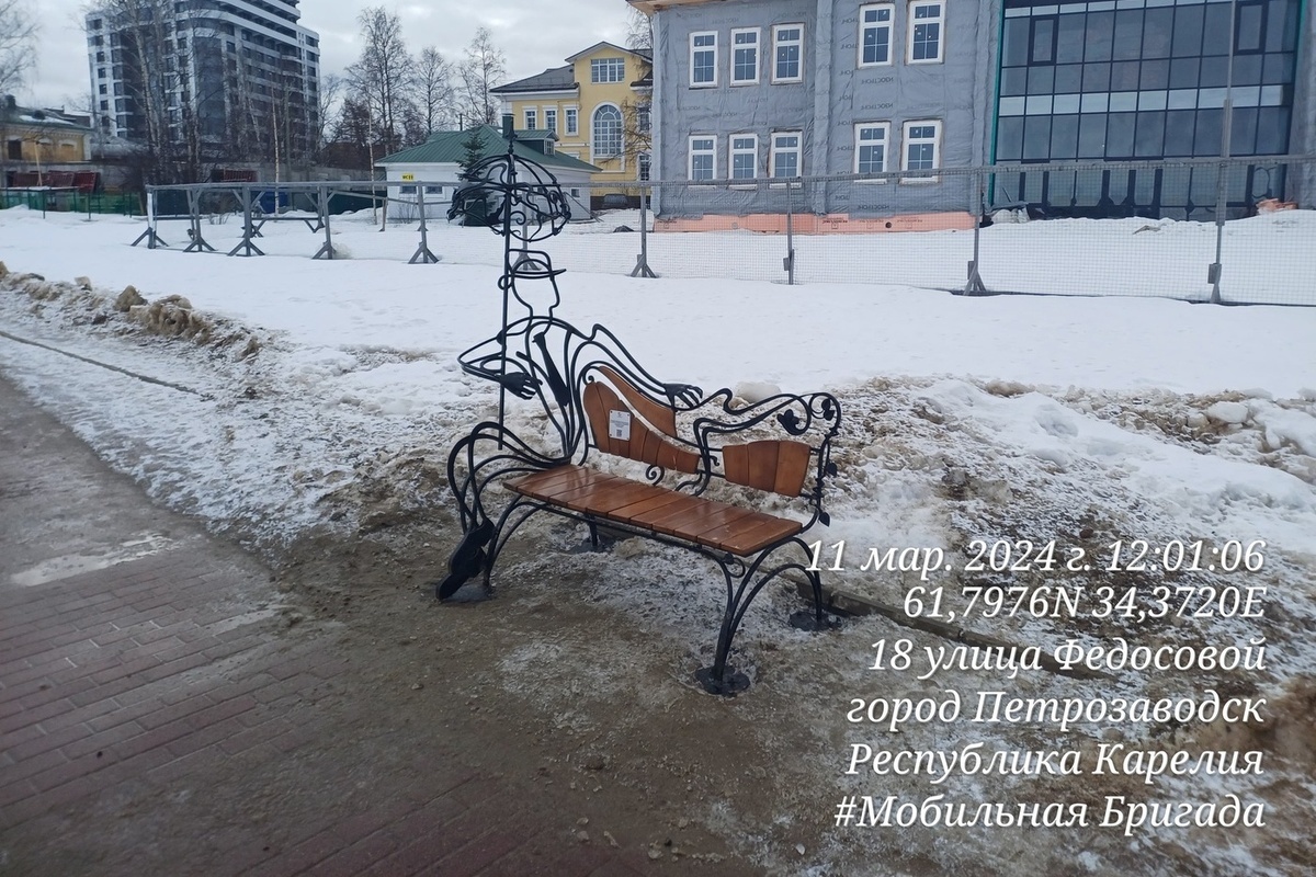Мэр карельской столицы отметила, что заявку на ремонт скамейки подали вечером 10 марта, в тот же день объект демонтировали, а уже утром следующего дня сварщик приступил к установке скамейки.