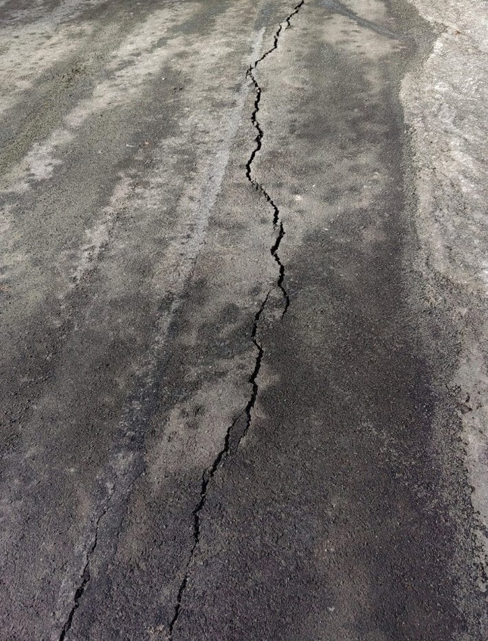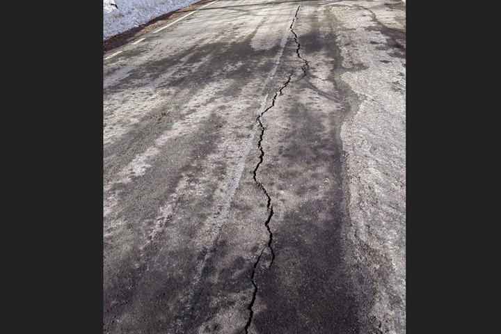 Местный житель поделился фото, на котором видны трещины длиной несколько метров, появившиеся в самом центре дороги.