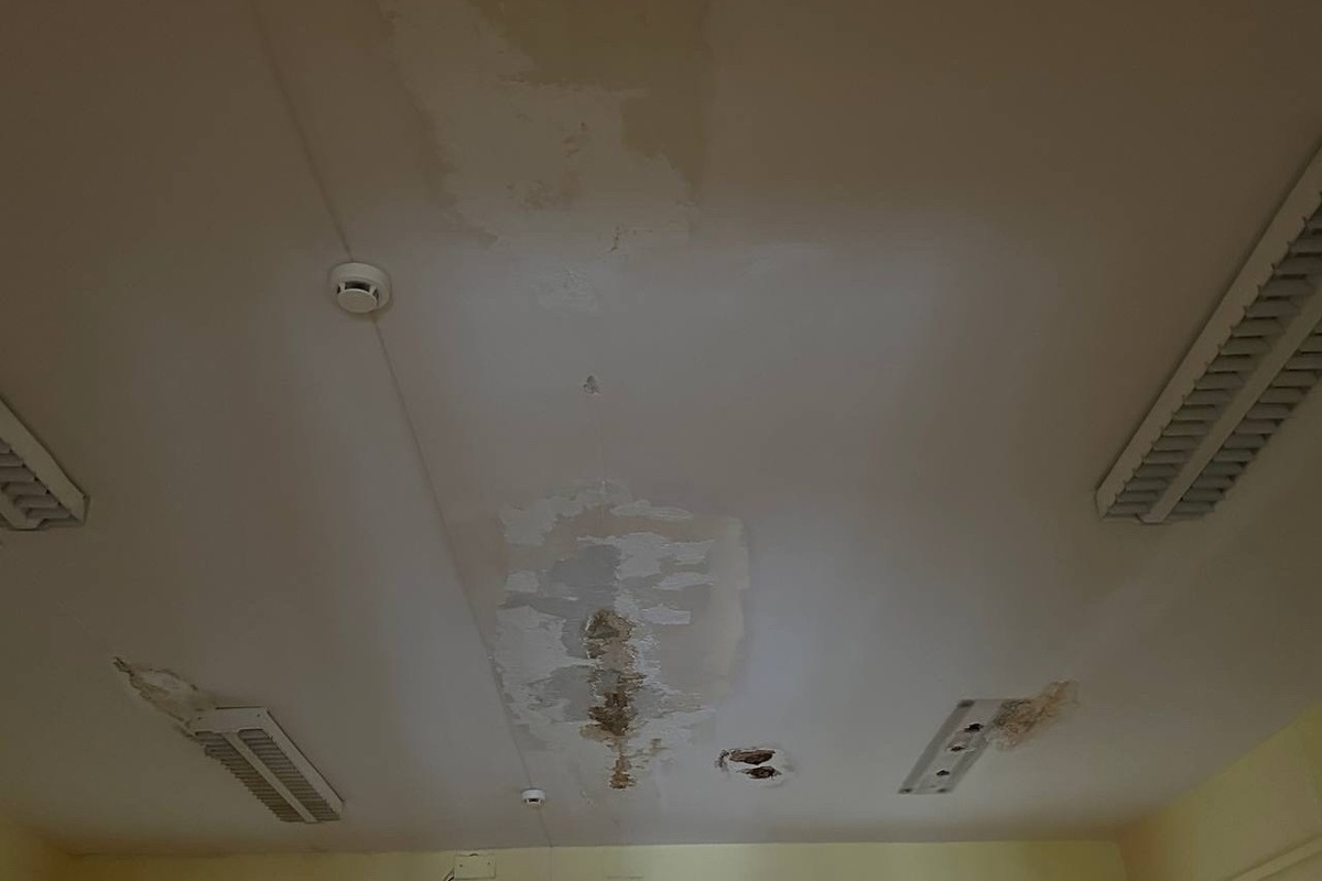 В паблике опубликованы фото, на которых запечатлен протекший потолок, с которого кусками свисает штукатурка.