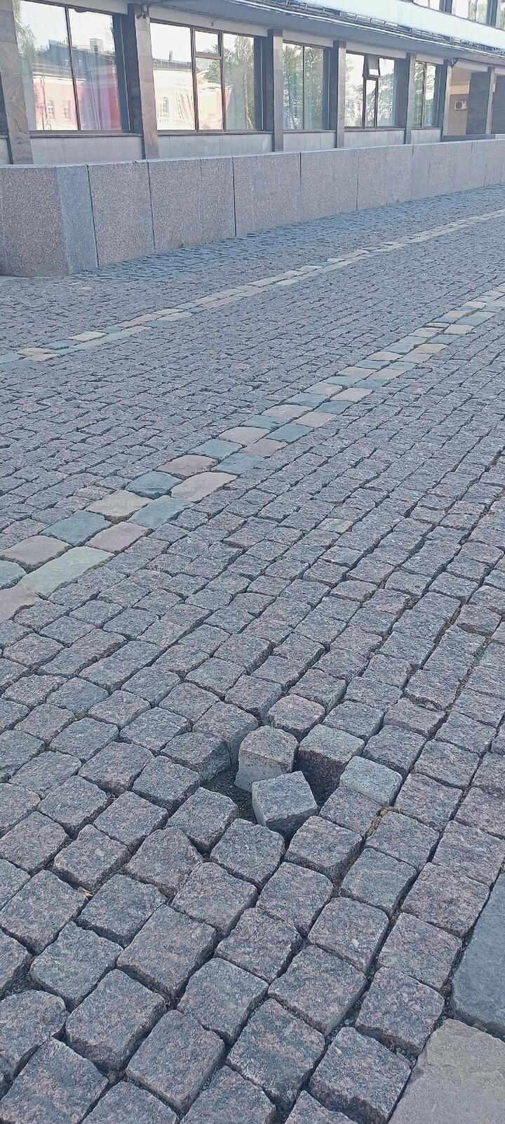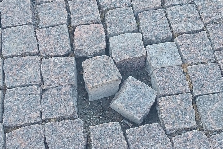 Брусчатка возле здания администрации Петрозаводска снова начала приходить в беспорядок. В одном из пролетов, там, где брусчатка уложена в основание не глубоко, камни начали выпадать из своих углублений. Фактически, многие каменные кубики никак не зафиксированы – они просто стоят рядами и легко двигаются. Поток людей, идущих на набережную, растет с каждым днем, что ожидаемо приведёт к дальнейшему разрушению.