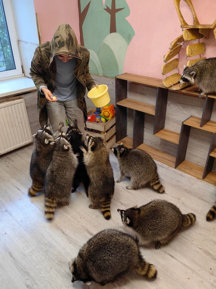 Одеваться, собираясь в гости к зверушкам, предпочтительно во что-то, что не жалко. Енот вскарабкается вам на спину, залезет на голову, и хорошо еще, если он будет один, что вряд ли. Скорее всего, на вас окажется вся куча мало разом, вы даже удивитесь, сколько енотов может одновременно разместиться на одном вас.