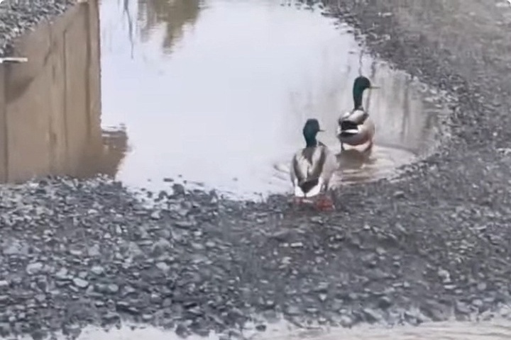 Жители Перевалки столкнулись с проблемой разбитой дороги на улице Бородинской. Проезжая часть превратилась в настоящее «болото» с огромными лужами, которые облюбовали утки.