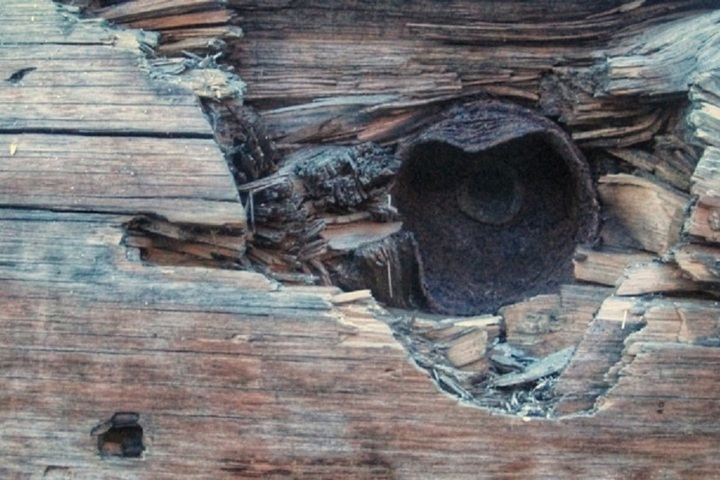 Научный сотрудник музея, Александр Любимцев, рассказал, что много лет назад он заметил странный металлический объект, вдавленный в бревно внутри звонницы. Изначально его приняли за деталь электроизолятора. Однако во время разборки восьмерика во время реставрации стало очевидно, что это часть боеприпаса, который каким-то образом разорвался внутри памятника. В другом бревне также были обнаружены свинцовые шарики.