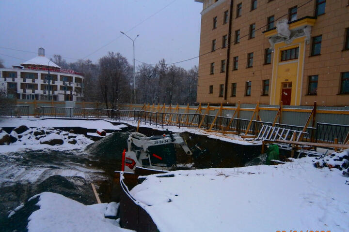 На снимках видно, что территория рядом с Музыкальным театром огорожена забором, а в её центре вырыт котлован, где активно трудятся рабочие с техникой.