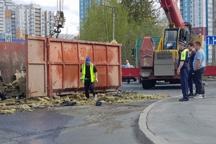 Ранее сообщалось, что упавший контейнер был поднят с помощью крана, а также проведена уборка разлетевшегося мусора.