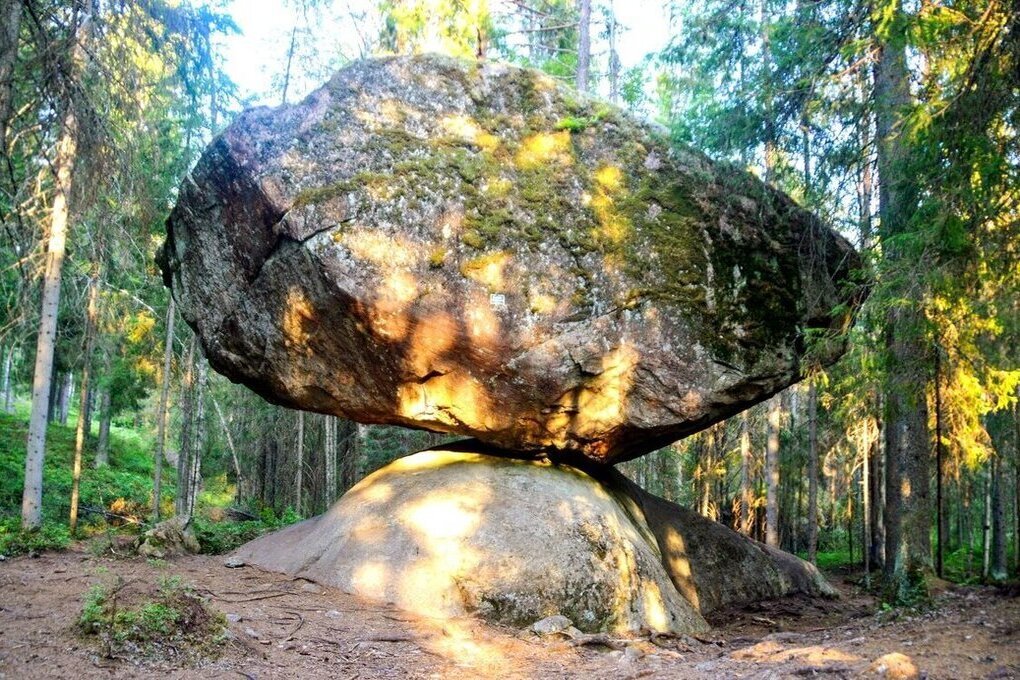 Турист из Петрозаводска воочию наблюдал финское чудо природы - балансирующий валун Куммакиви. Громадина весом в пятьсот тонн лежит на другом валуне, площадь соприкосновения с которым всего пол квадратных метра.