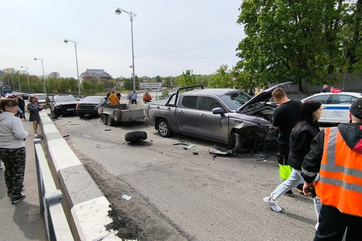 Иномарка вылетела на перекресток на «красный» и протаранила сразу несколько машин. В результате аварии автомобили получили серьезные механические повреждения, мост был перекрыт.