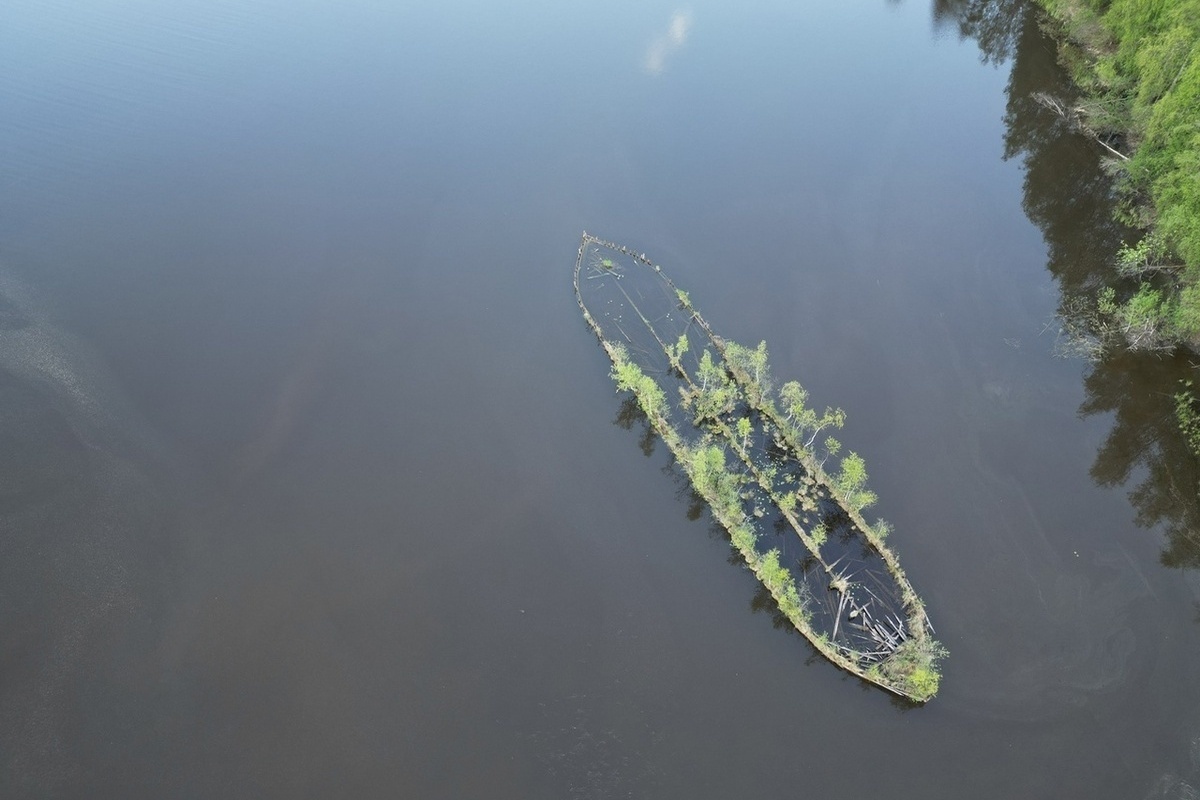 На снимках хорошо видно, как разрушенные древесные корпуса кораблей образуют своеобразное острова. На этих «островах» начали расти деревья и кустарники.