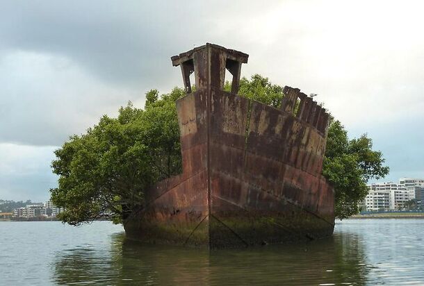 Удивительная достопримечательность недалеко от Сиднея - Плавучий лес - это всемирно известный природный феномен. Могучее судно SS Ayrfield было списано за ненадобностью в 1972-ом году и с тех пор, брошенное в устье реки, постепенно зарастало деревьями, которые сегодня достигают трех метров в высоту. Сам гигант в длину около восьмидесяти метров, а потому образовавшийся на его борту оазис по праву носит название леса. Кораблю уже более ста лет, он был спущен на воду в 1911-ом году.