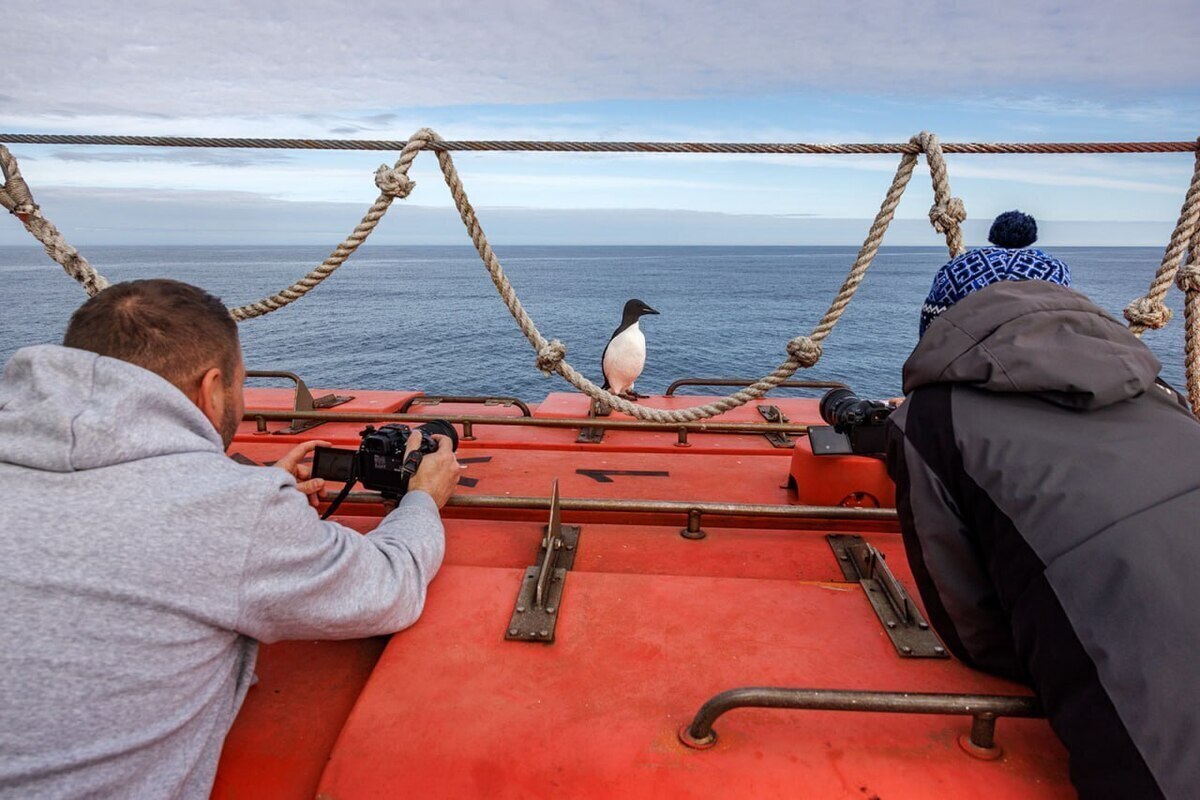 Из интересного - в какой-то момент, когда мы с Александр Ермолин и Андрей Паршин стояли на палубе с фотокамерами и обсуждали особенности "Canon-Nikon" (вечная тема), прямо рядом с нами на спасательный шлюп прилетела кайра. Это не типичное поведение для кайры, хотя и не редкое.