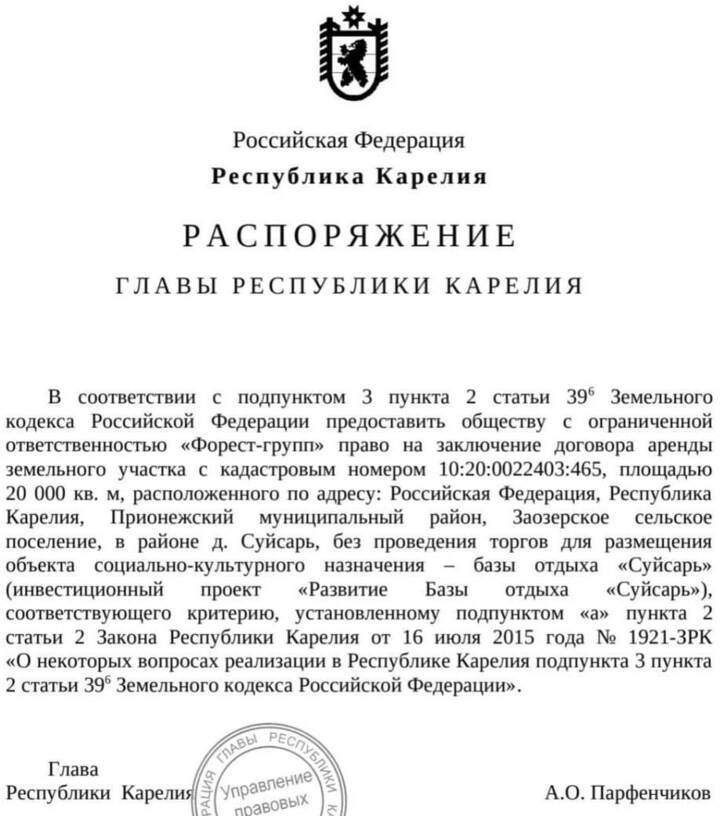В сентябре 2024 года распоряжением главы республики ООО «Форест-групп», которым управляет Ирина Перова, получило право на заключение договора аренды этого земельного участка. Причем без торгов, поскольку здесь планируется вести туристический бизнес, а объем инвестиций должен составить десятки, а то и сотни миллионов рублей – эти критерии прописаны в законе. Проект получил витиеватое название «Создание рекреационной зоны для завершения реализации масштабного инвестиционного проекта «База отдыха «Суйсарь».
