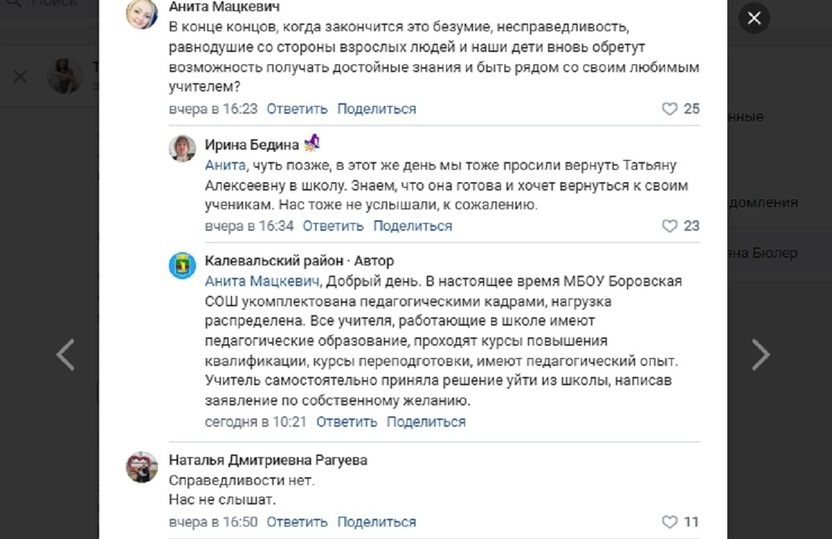 Но школа строится на авторитете учителя, на его репутации. И, видимо, эту репутацию придется защищать, в том числе и в судебном порядке. Процесс в Боровом уже запущен: бывшая директор школы подала иски о защите чести и достоинства к тем, кто занимался очернительством в ее адрес. В том числе и к паблику в социальной сети, «раскручивавшему» конфликт с ее участием, и ни разу не поинтересовавшимся ее мнением.