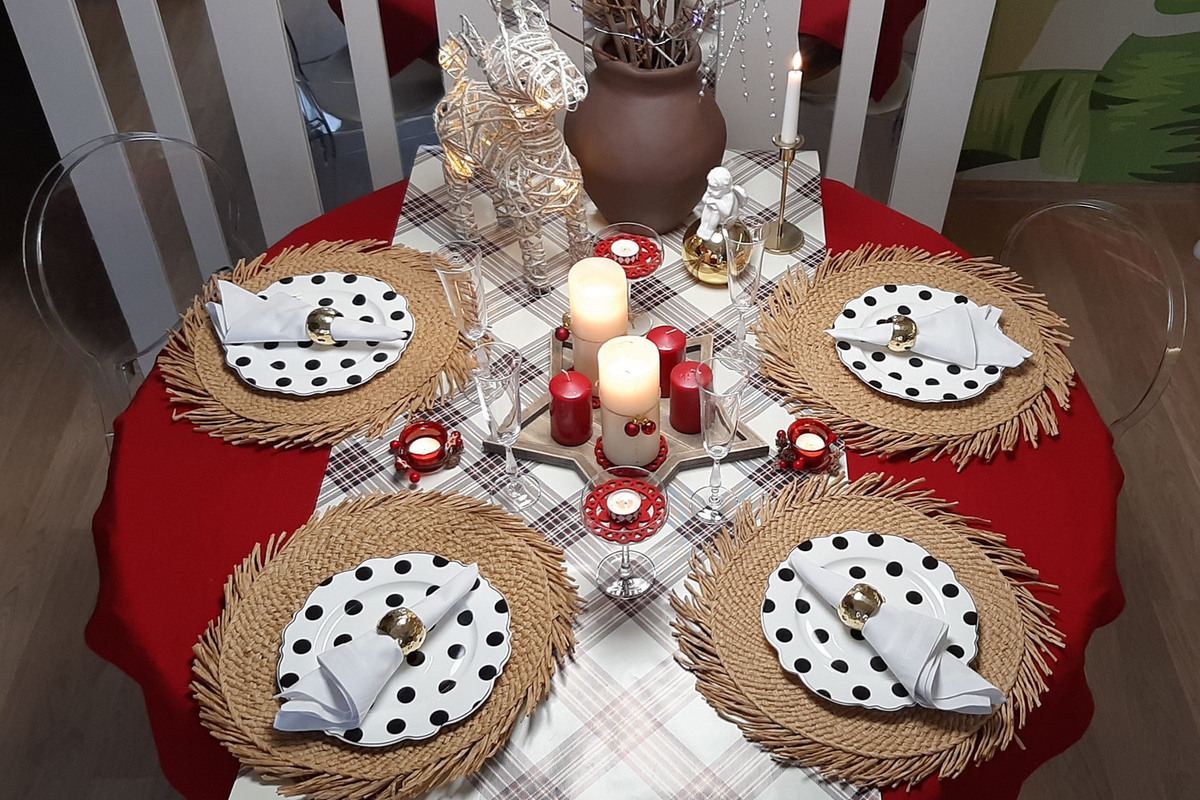 2.Основа сервировки — текстиль. Удобно использовать базовую однотонную скатерть (для новогодней сервировки лучше подойдет белая, зеленая или красная), а поверх неё — новогоднюю дорожку с рисунком. Это простой приём, который сразу добавляет глубины и слоёв, делает стол более собранным и нарядным. Останется добавить только индивидуальные салфетки. Если есть время можно свернуть и красиво завязать текстильные салфетки. Также отлично впишутся бумажные, соответствующие тематике.