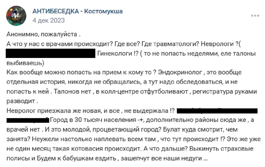 Прошло два года, но, по рассказам костомукшан, ничего не изменилось: в городе по-прежнему невозможно записаться к неврологу, гинекологу, травматологу. Ближайшая клиника, где можно попасть к ним на прием – Петрозаводск.