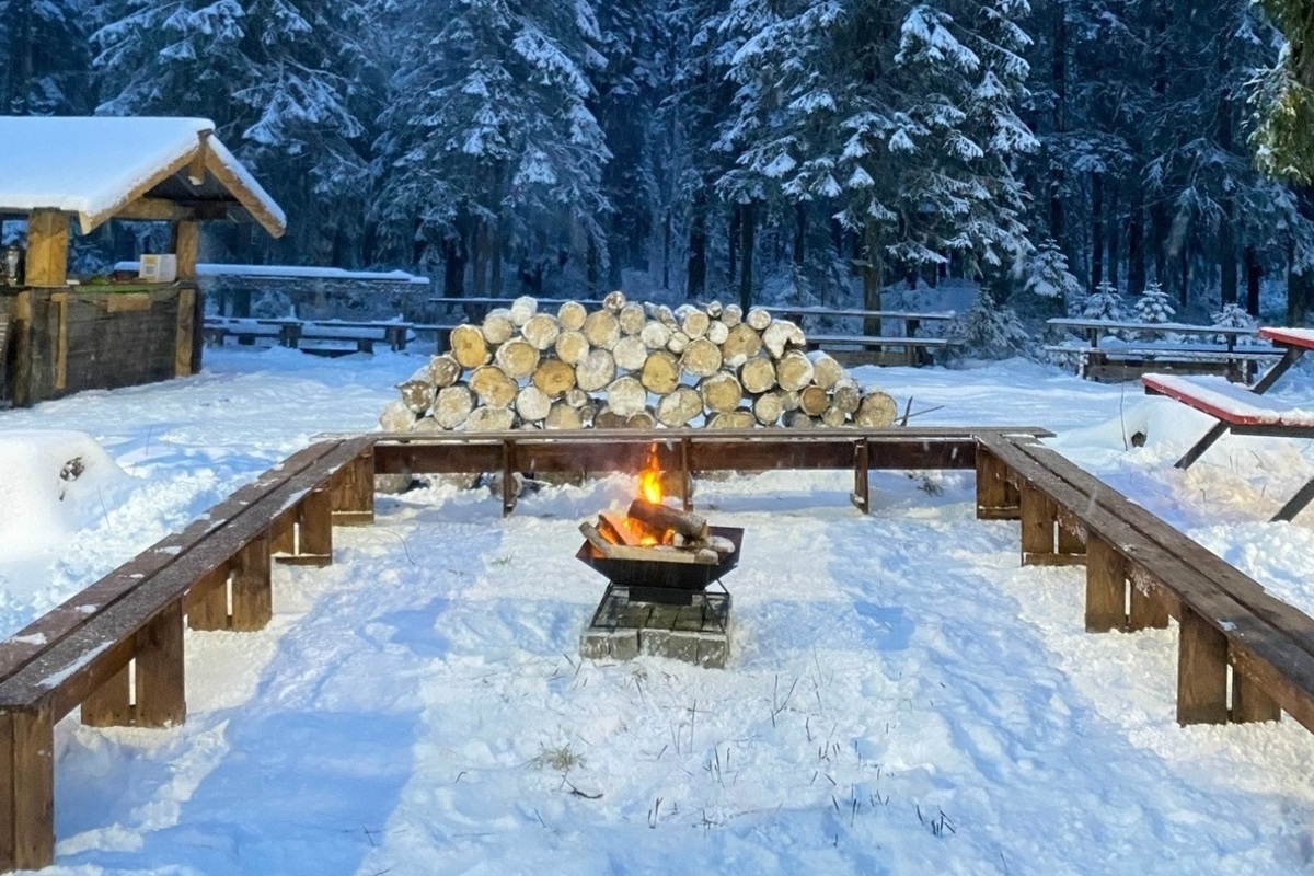 Как говорится в сообщении, для приятного отдыха у огня у развилки подготовлена уютная семейная зона с костровой чашей. Уже готов наш обещанный подарок — теперь вам будет удобно жарить маршмеллоу и сосиски.