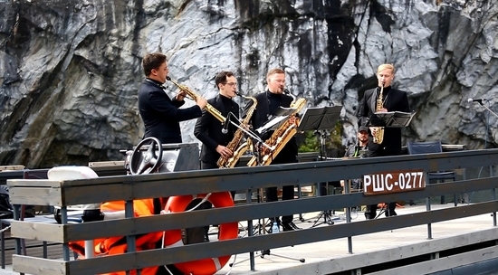 Не все приглашенный сразу понимают, что проект «Музыка на воде» - это не образное выражение. Плот, на котором давали концерт Владимир Кознов (сопрано-саксофон), Геннадий Полуяктов (альт-саксофон), Станислав Пялов (тенор-саксофон) и Илья Богомол (баритон-саксофон) стоял посреди Мраморного кареьера Рускеала, а зрители в буквальном смысле свисали с обрыва.
