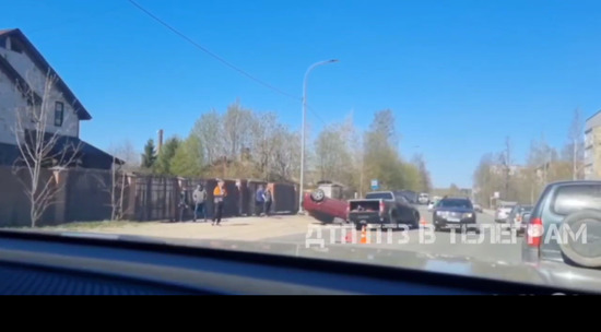 Утром 18 мая на улице Гвардейская в Петрозаводске столкнулись два автомобиля, один из которых перевернулся.
